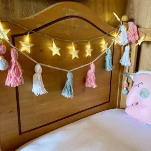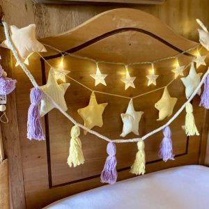 CUELGA ESTRELLAS + CUELGA BORLAS AMARILLO Y LILA