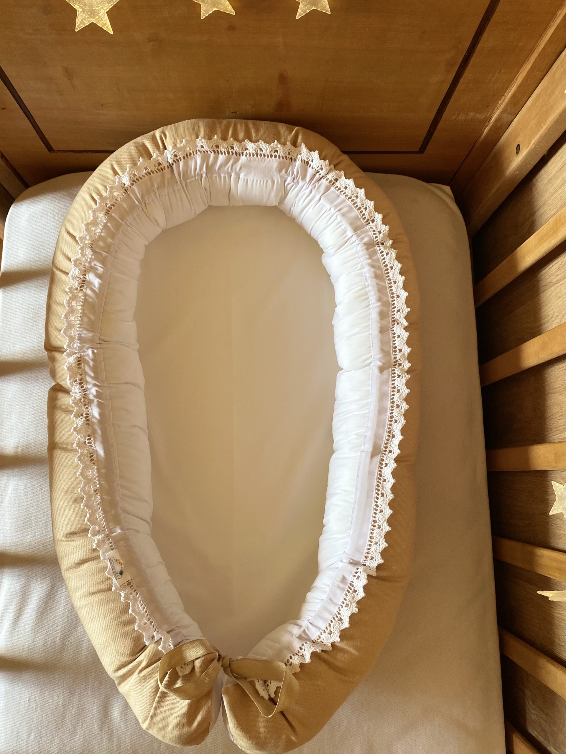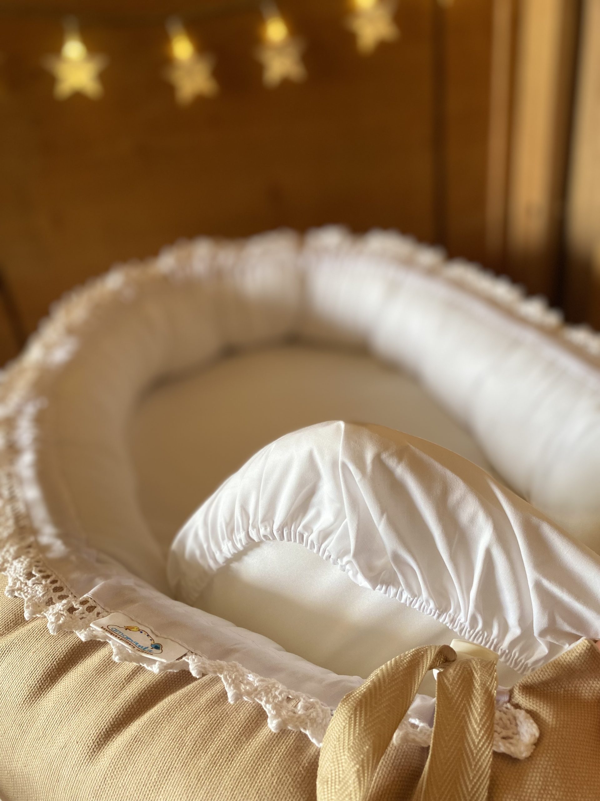 Nido Colecho: 50x75cm., medida total. Con blonda bolillo algodón por todo el contorno + colchón con sabanilla + MANTITA ALGODÓN