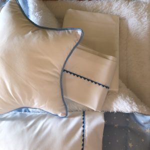 - – Set de sabanas blancas 200 hilos en tela 100% algodón., Incluye: bajera con elástico en sus 4 puntas, encimera con vuenta en gris o blonda broderie ( elección), funda para almohadita 40x25cm.